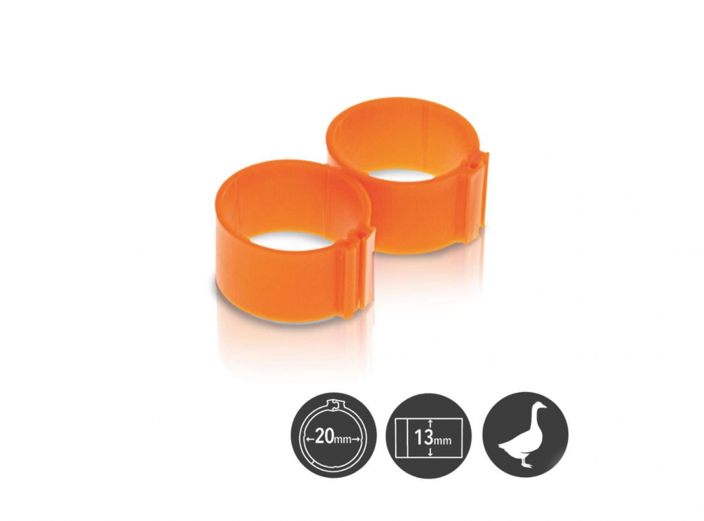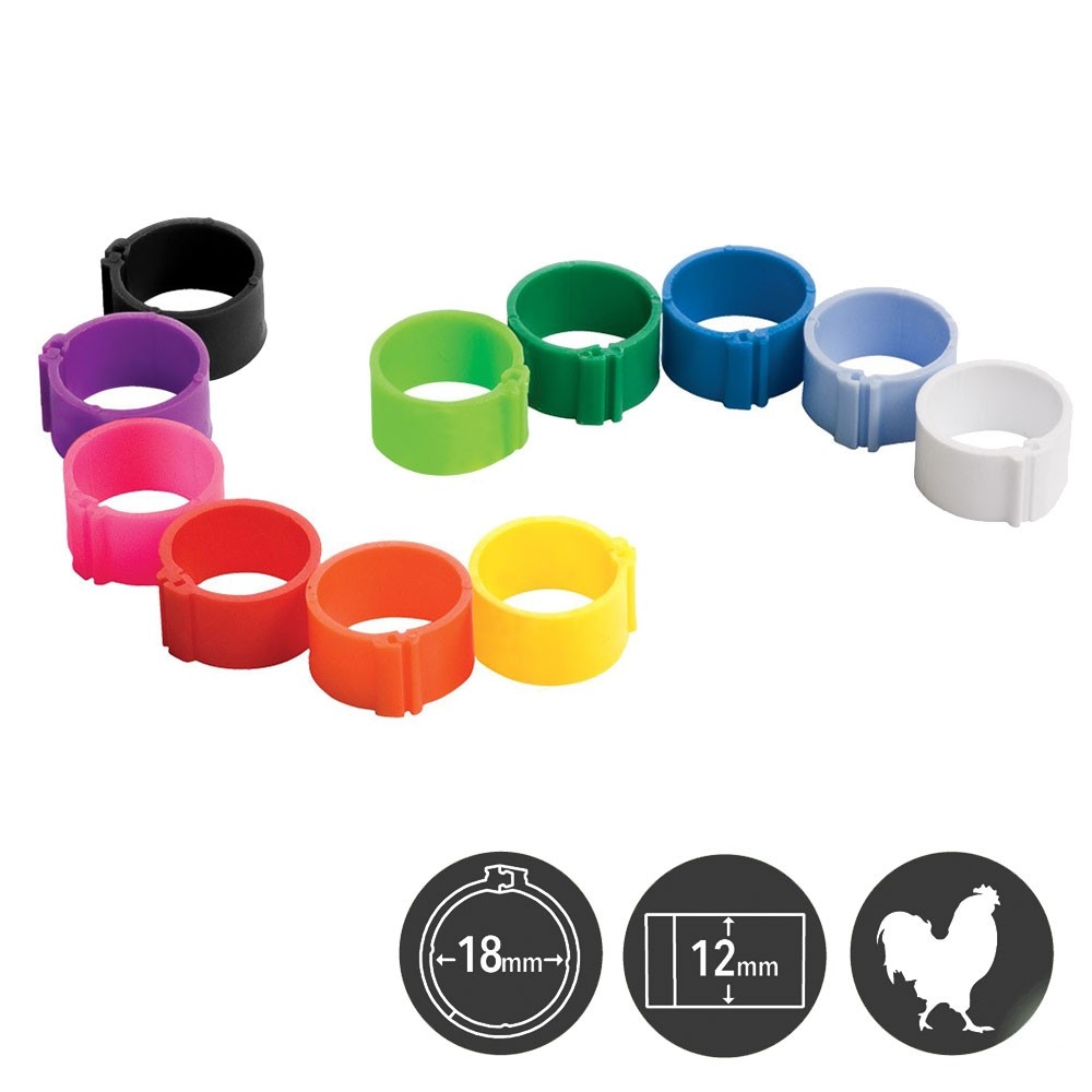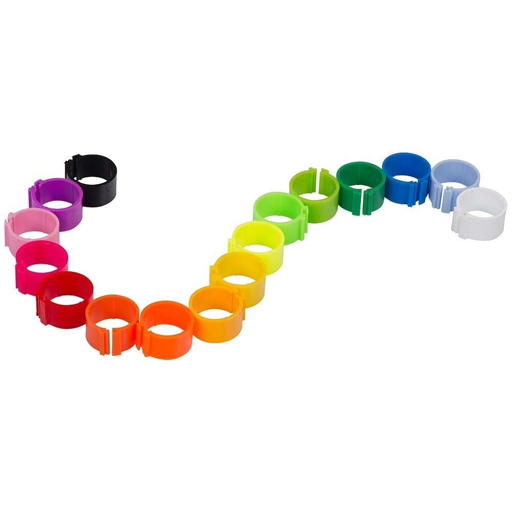 Fotringer til høns, ender, fasaner m.fl. 100 stk. i esken. Innvendig mål: 16 mm. Velg mellom fem farger. Åpnes og lukkes enkelt.