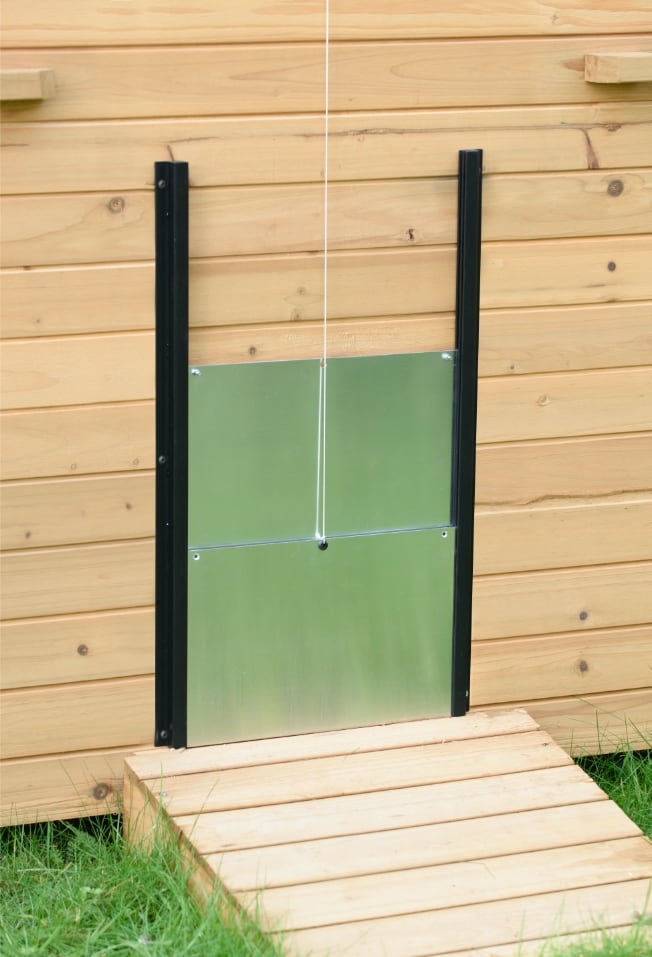 En solid, plassbesparende, universell, loddrett hønsehusdør fra Brinsea som matcher døråpnere til hønsehus. En 2-trinns metalldør minimerer den totale høyden som kreves. Leveres komplett med dørløpere.