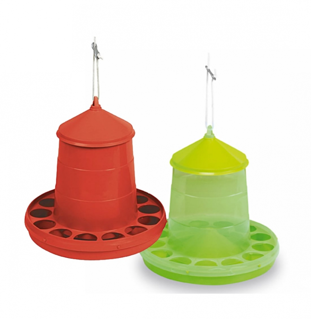 Denne praktiske galvaniserte forautomaten i zink for fjærfe har en kapasitet på 5 kg, og et svart plastlokk til beskyttelse av foret.