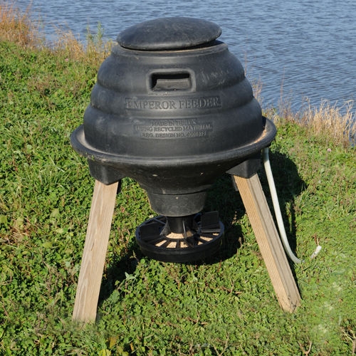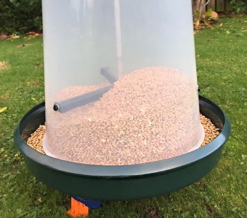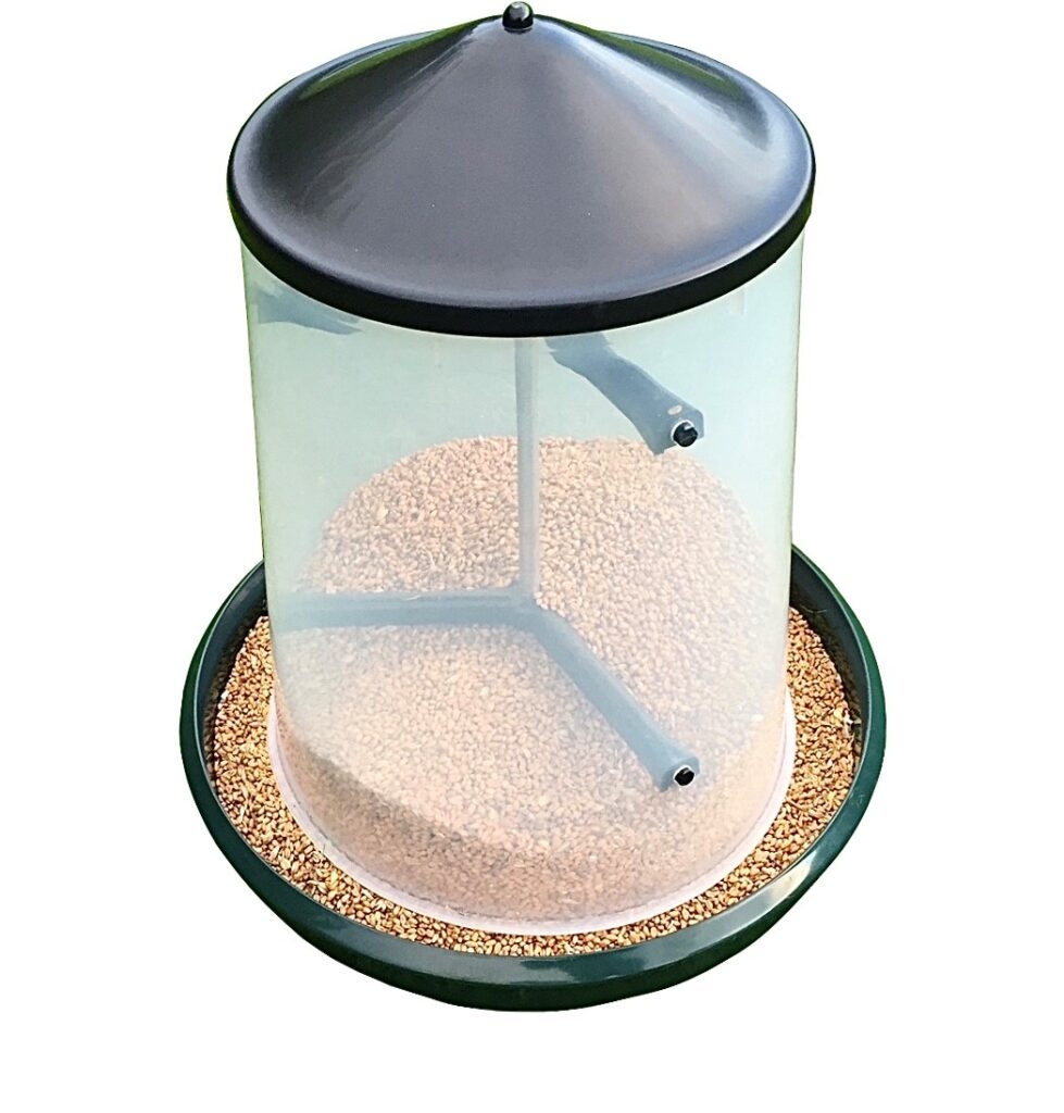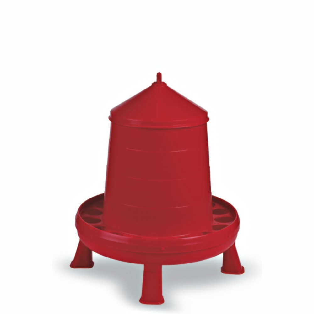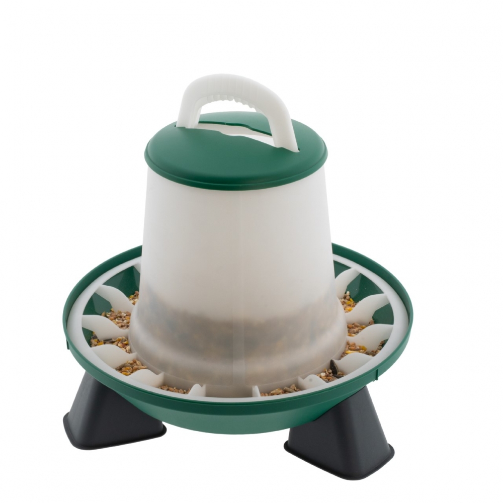 Fôrautomat 18 kg med føtter. Den er av topp kvalitet og laget av kraftig plast, men den er lett nok til å henges opp.