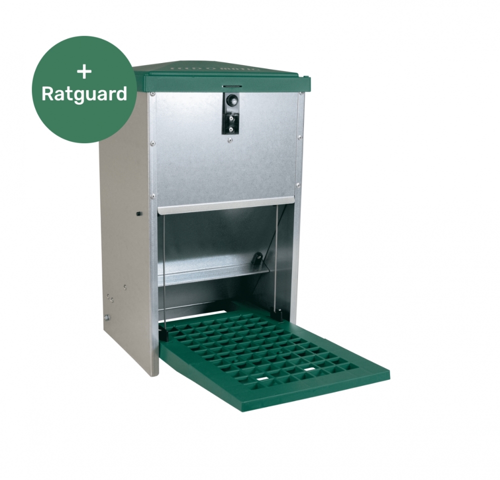 Vår populære automatiske mater har et oppdatert lokk, fôringsrenne og er utstyrt med rottebeskyttelse. Med Feedomatic vil du ikke lengre ha problemer med mus, rotter og fugler på forplassen.