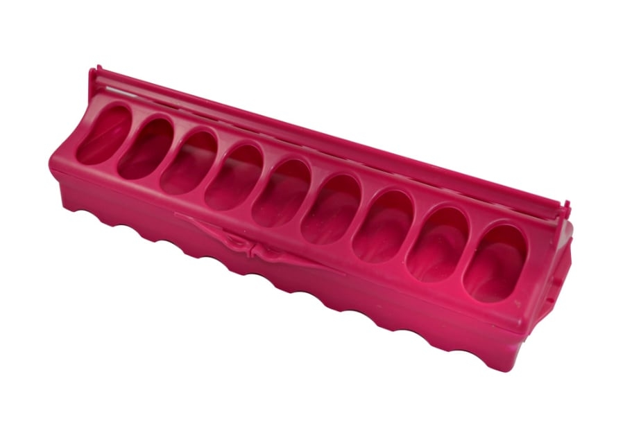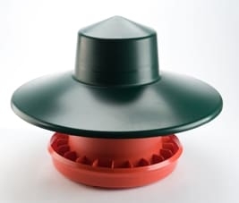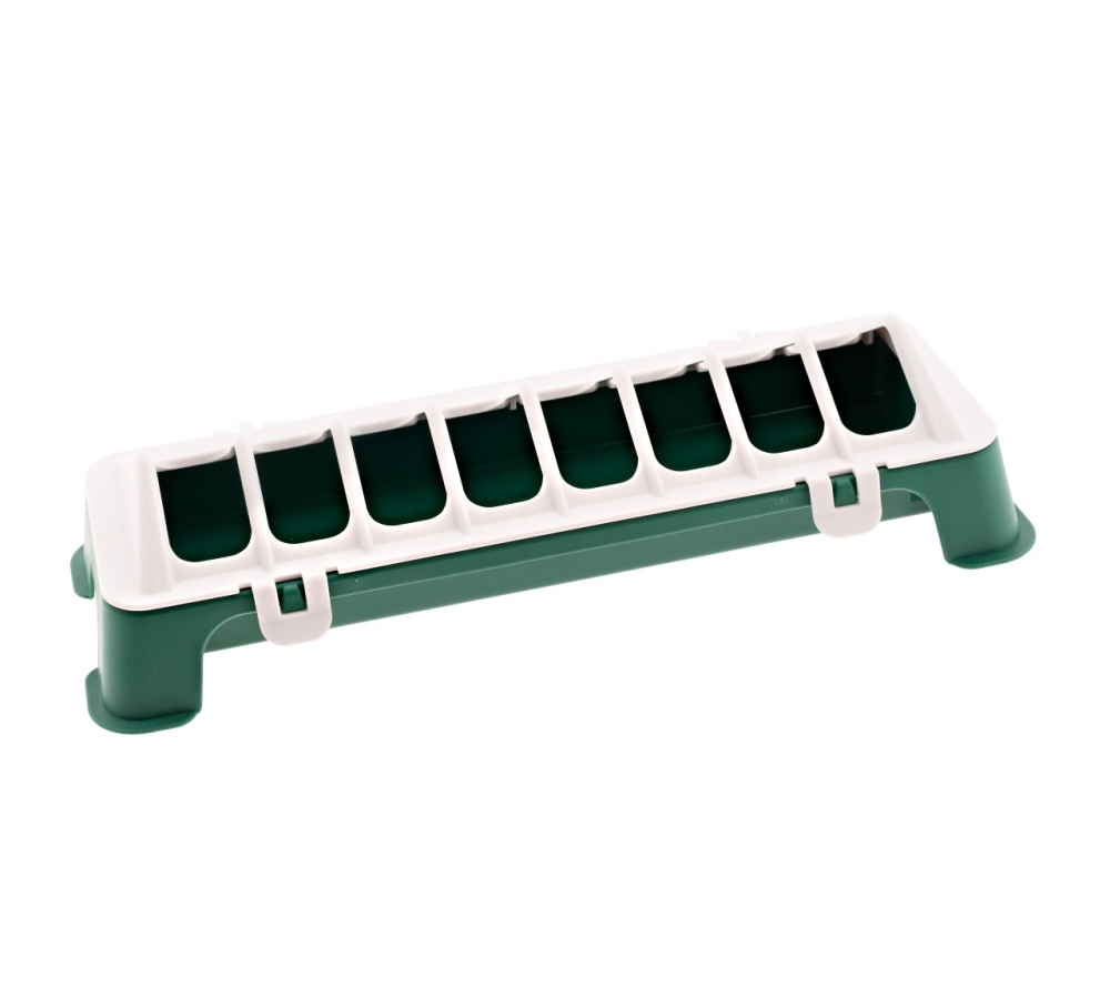 Unik fôrskål for fjærfe med en spesiell v-formet fôrinngang. Denne materen forhindrer sløsing med fôret.