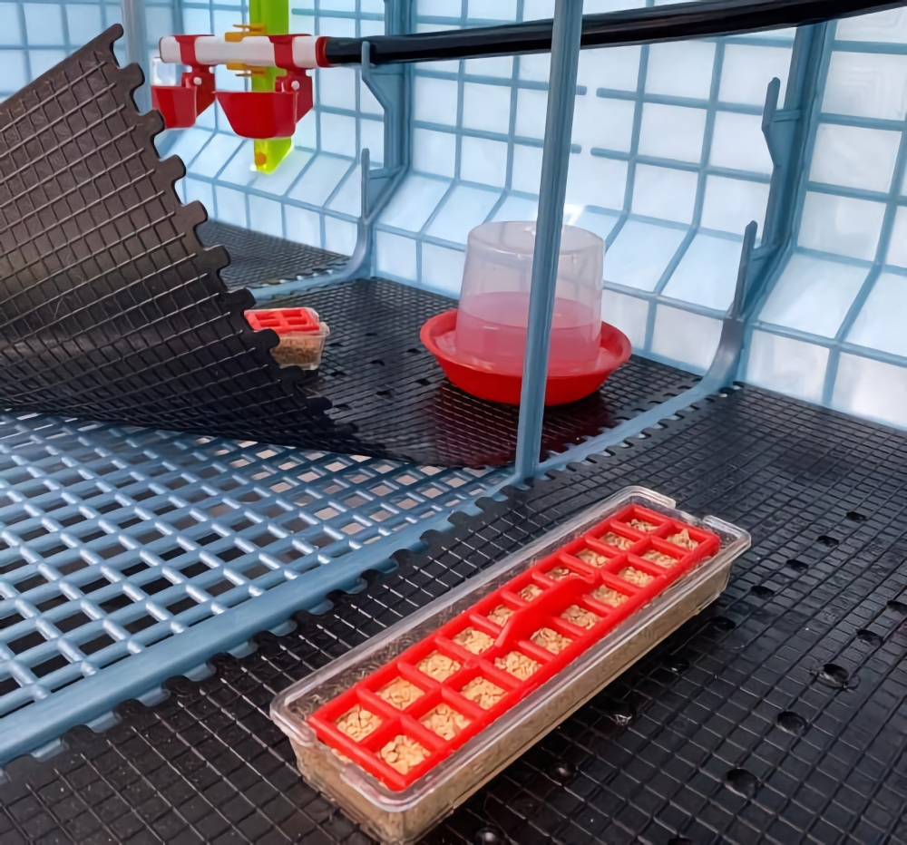 Startmater for frittgående oppsett eller kyllinger. Røde fôrgrilldeksler hindrer søl av fôr utenfor trauet.