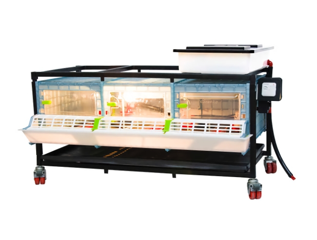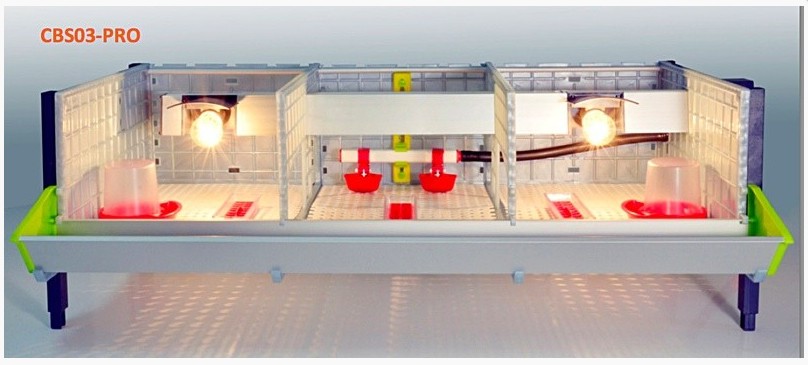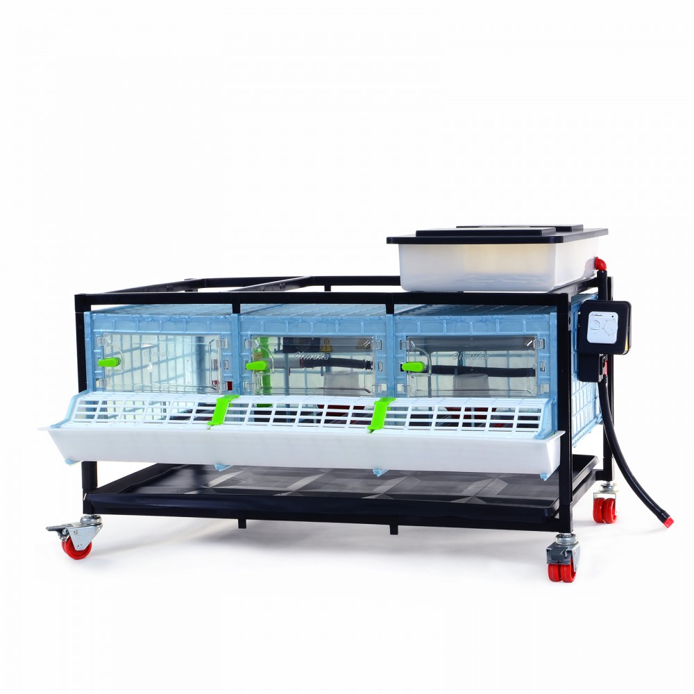 Oppdrettsreol med automatisk styring av varme og lys, samt drikkeautomat med drikkenipler. Passer til kyllinger av vaktel, høns, fasaner, og svømmefugler.