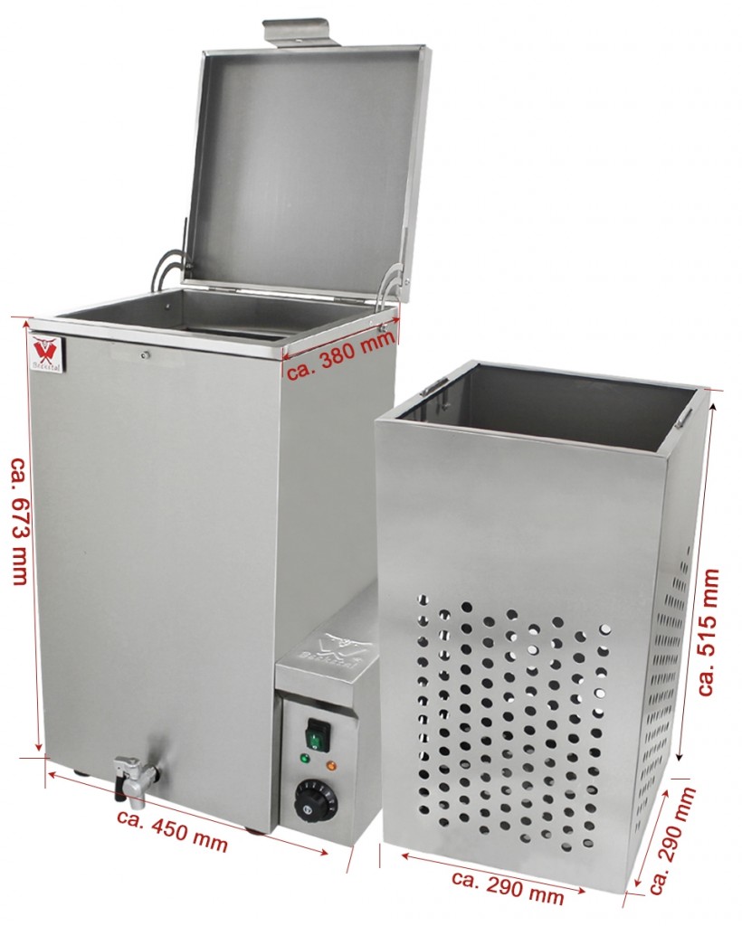 Kabinen er laget av rustfritt stål av høy kvalitet. Takket være den store kapasiteten på 70 liter kan flere fjørfe skåldes på svært kort tid.