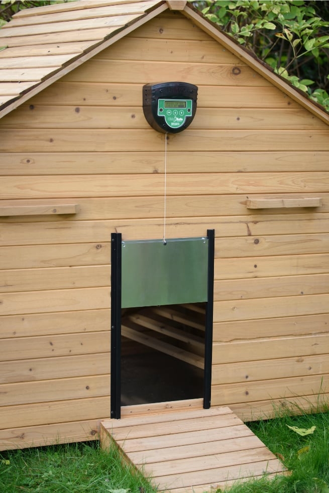 - En tøff, plassbesparende, universell, loddrett glidende hønsehusdør som matcher ChickSafe døråpner.