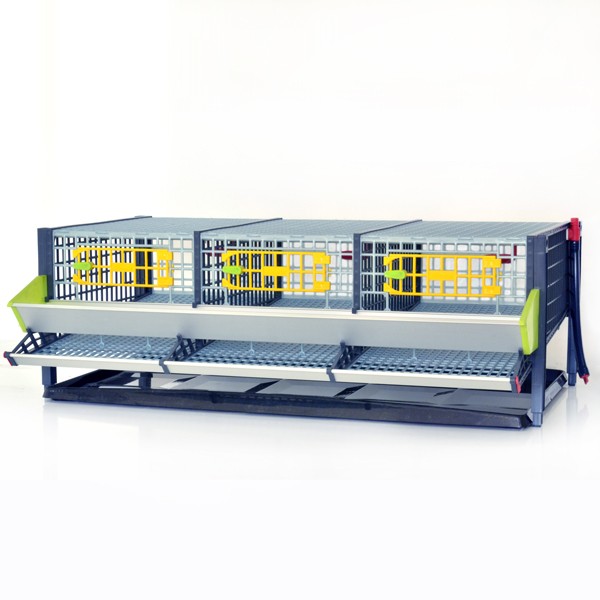 Vaktelbur i aluminium med høykapasitets forer, med en fôring hver 2 dager. Forbrett med nær null fortap. Plast gjødselpanne. Filtrert vann tank, med tilpasset svart silikon slange for å hindre alger. Drikkenipler med automatisk vanningssystem for å hindre vannsøl.